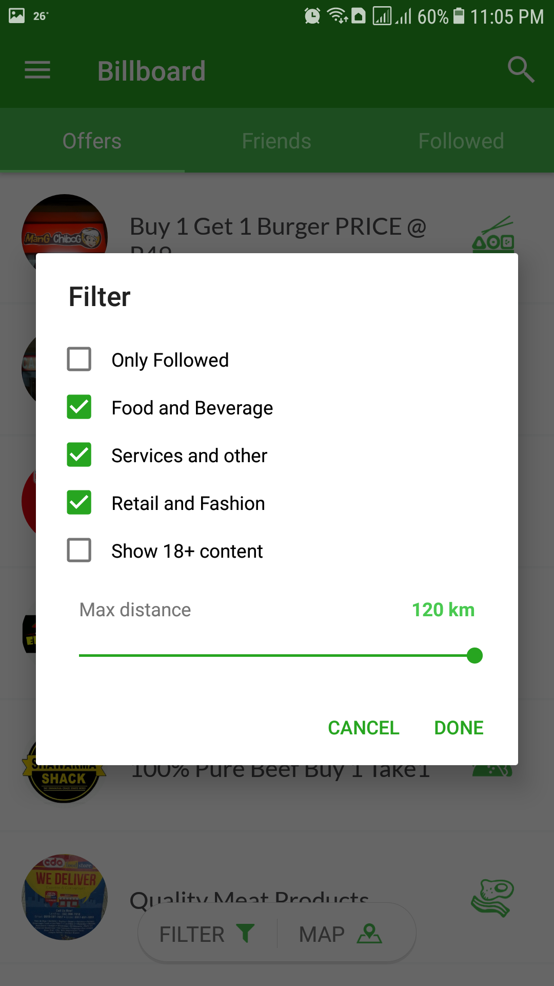 The app uses a familiar and user-friendly interface. It integrates instant messaging and business promotion. The billboard tab showcases a list of ongoing promotions around the vicinity. Thanks to Piip’s Geo-Targeting feature! The filter option maybe used to select different types of promos and proximity search.
