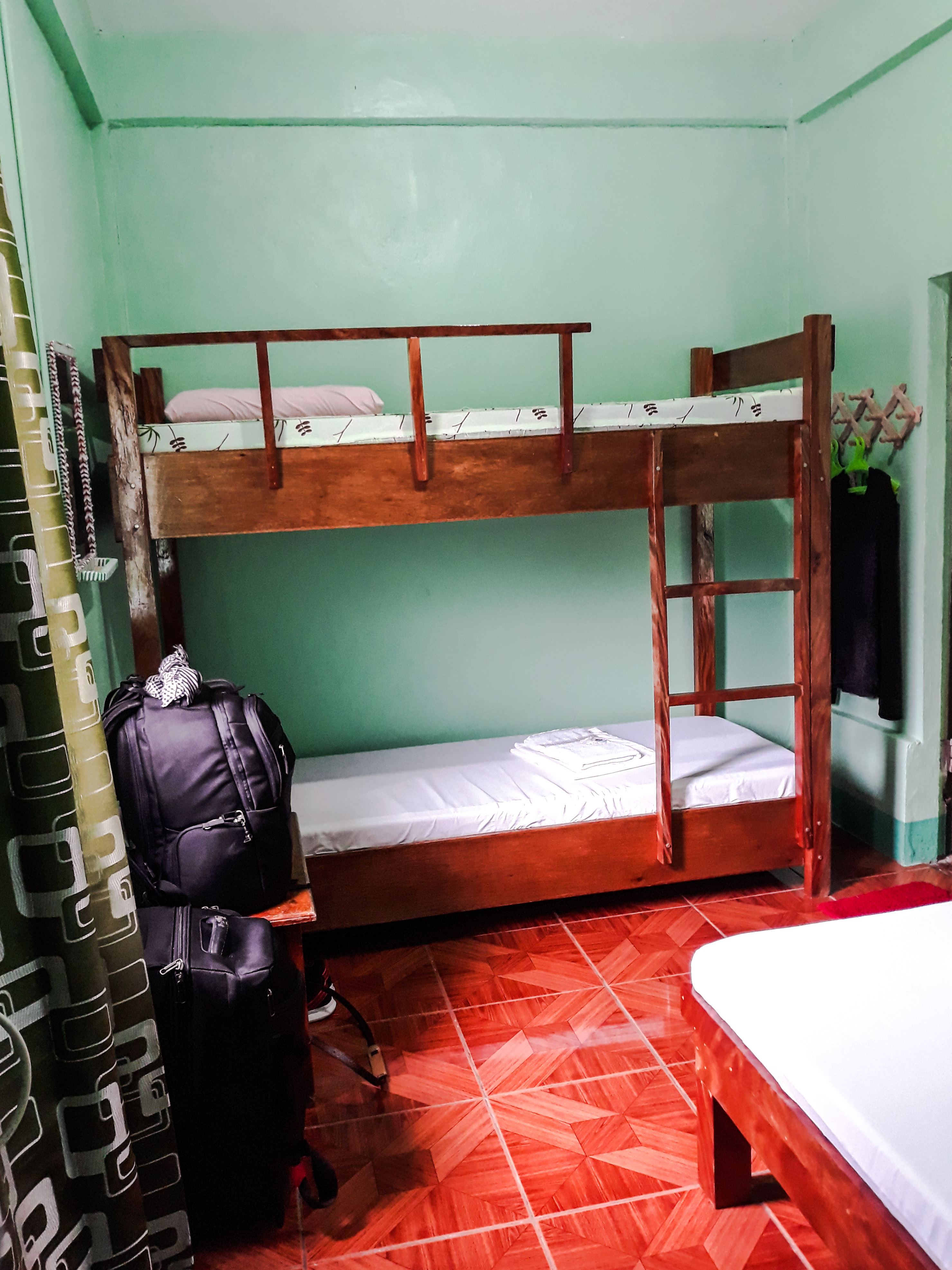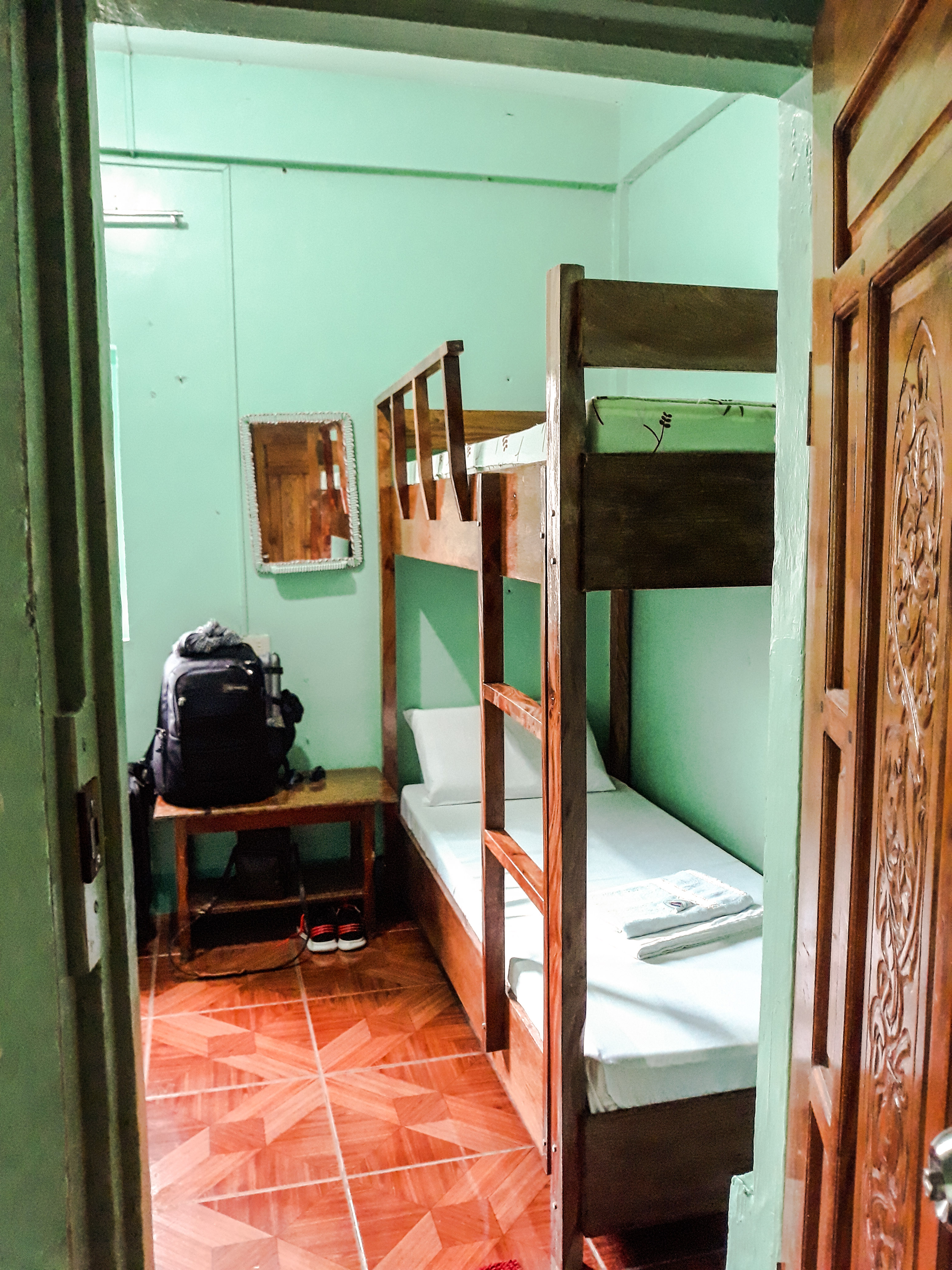 My room has a double deck and a queen size bed, good for a group of two or three. It has its own toilet and bath and air-conditioning.